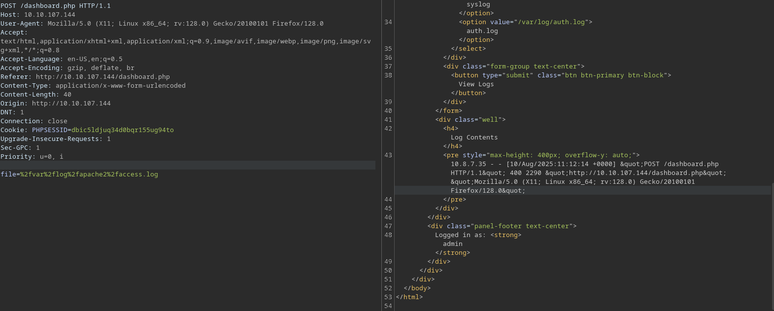 looking at the request to read file in burp, I able to read other log files too. But I cannot read /etc/passwd